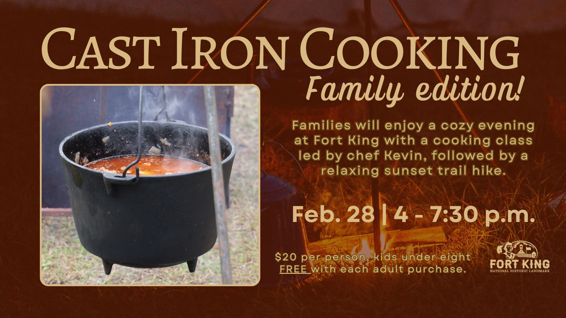 Kids and parents can enjoy a cozy evening around the campfire at Fort King! Join Chef Kevin from Crones Cradle Conserve for a fun, hands-on family-friendly cooking class, then relax with a sunset trail hike to end the night.