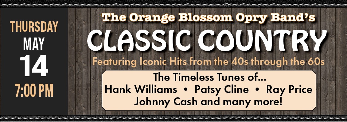 Get ready for a trip down memory lane as the Orange Blossom Opry Band brings you the best of classic country! The OBO Classic Country Show will feature iconic hits from the 40s through the 60s, with songs from legends like Hank Williams, Patsy Cline, Johnny Cash, Ray Price, and many more.