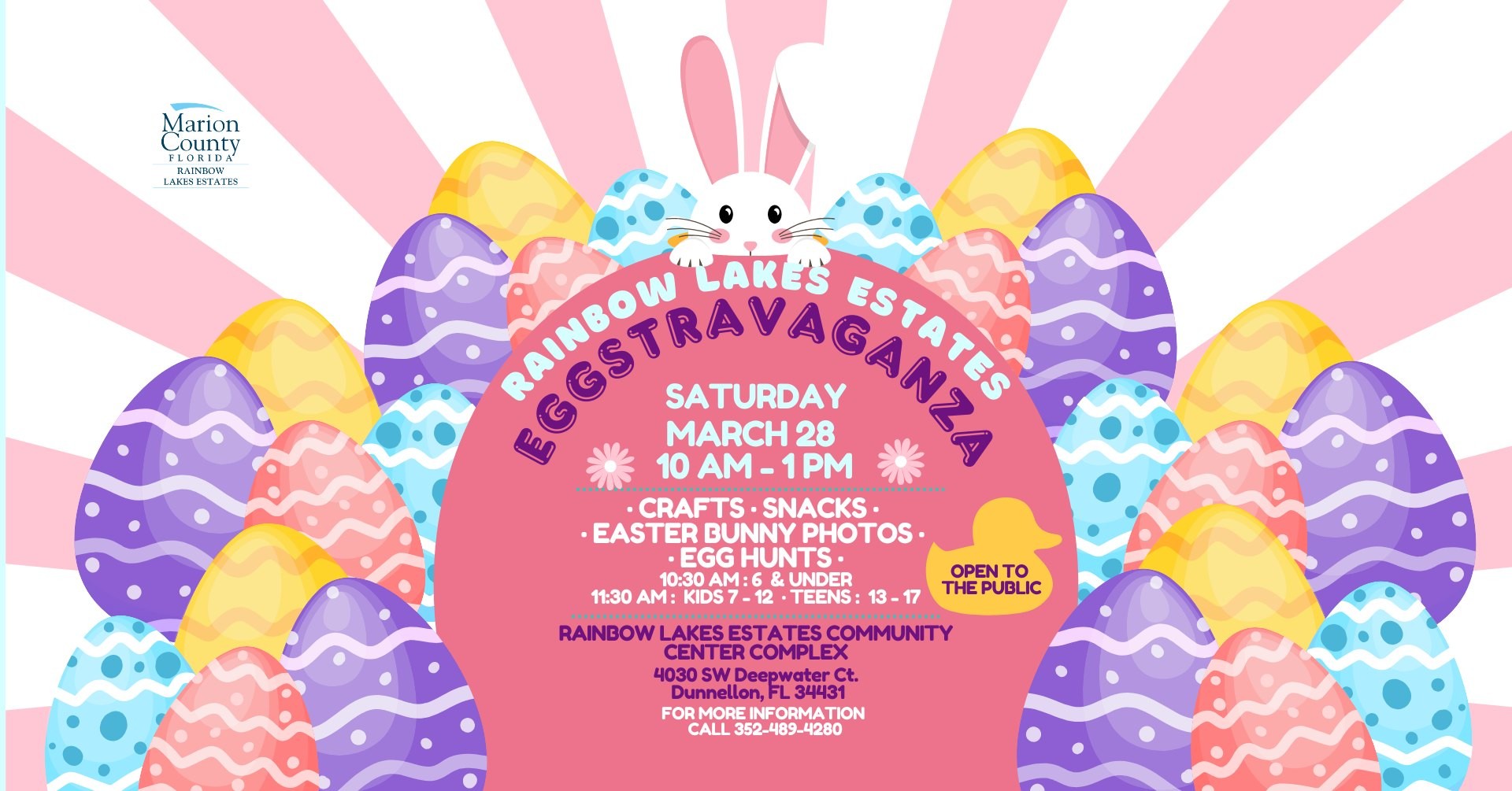 Join us for a fun-filled morning at the RLE Eggstravaganza at the Rainbow Lakes Estates Community Center Complex! Bring the whole family out on Saturday, March 28 from 10 AM – 1 PM for crafts*, snacks*, Easter Bunny photos, and exciting egg hunts for all ages.
