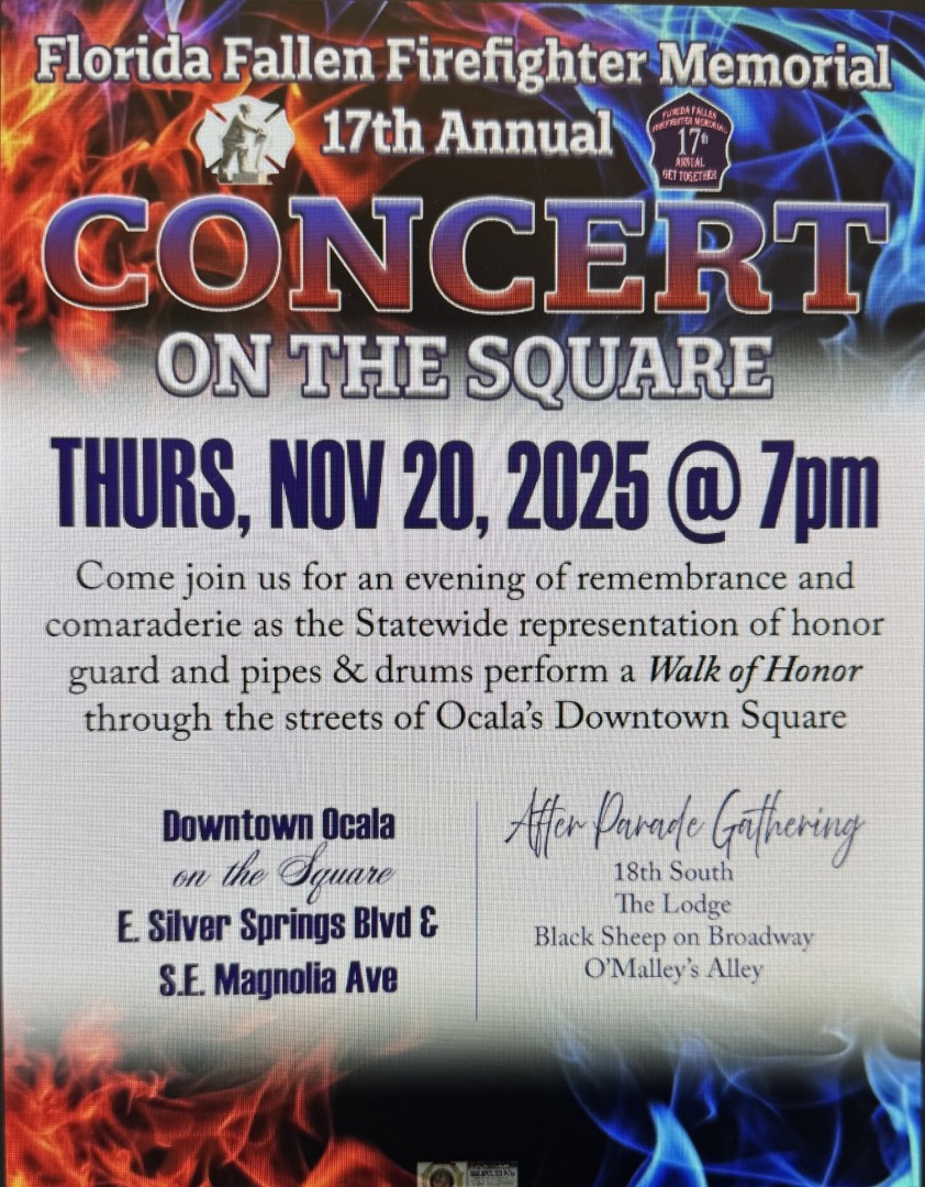 Come join us for an evening of remembrance and camaraderie as the Statewide representation of honor guar and pipes and drums perform a Walk of Honer through the streets of Ocala's Downtown Square.