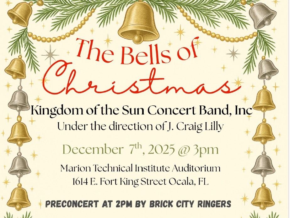 The Kingdom of the Sun Concert band will present their holiday concert, “The Bells of Christmas” on Sunday, December 7th, 3:00 pm at the Marion Technical Institute Auditorium, 1614 E. Fort King Street in Ocala. Under the direction of J. Craig Lilly, the band will be joined by the Brick City Ringers, Ocala’s community bell choir, with a pre-concert performance at 2:00. The Brick City Ringers will also be featured on a music selection with the band. The concert is free to attend, with donations accepted. For more information, visit https://www.kingdomofthesunband.org or call 352-390-0491.