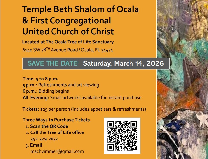 Temple Beth Shalom and First Congregational United Church of Christ will host a Live Art Auction Gala on Saturday, March 14, 2026, to benefit their Interfaith Ocala Tree of Life Sanctuary. The Live Art Auction Gala will be held at the Tree of Life Sanctuary, 6140 SW 78th Avenue Road. The event will feature paintings by 16 local professional artists representing a variety of mediums, styles and subjects.