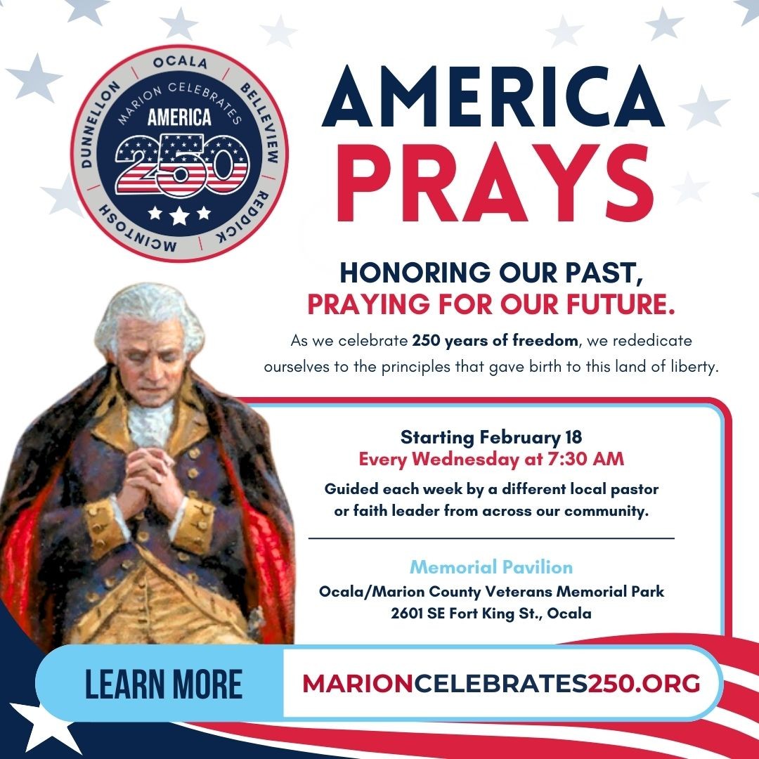 Each Wednesday morning, from 7:30–8:00 AM, community members, churches, schools, and local leaders gather for a brief, united time of prayer at the Ocala/Marion Veterans Memorial Park Pavilion. The format is simple, and the focus is prayer.