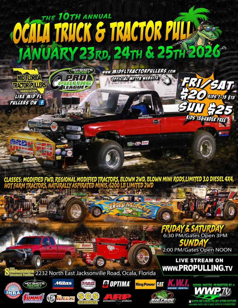 The 10th Anniversary of the Ocala Truck and Tractor Pull will bring the best show we have ever had. January 23rd, 24th, and 25th. Plenty of food, merch, and collectables. The power on the track will feature Classes: Modified FWD, Regional Modified Tractors, Blown 2WD, Blown Mini Rods, Limited 3.0 Diesel 4x4,