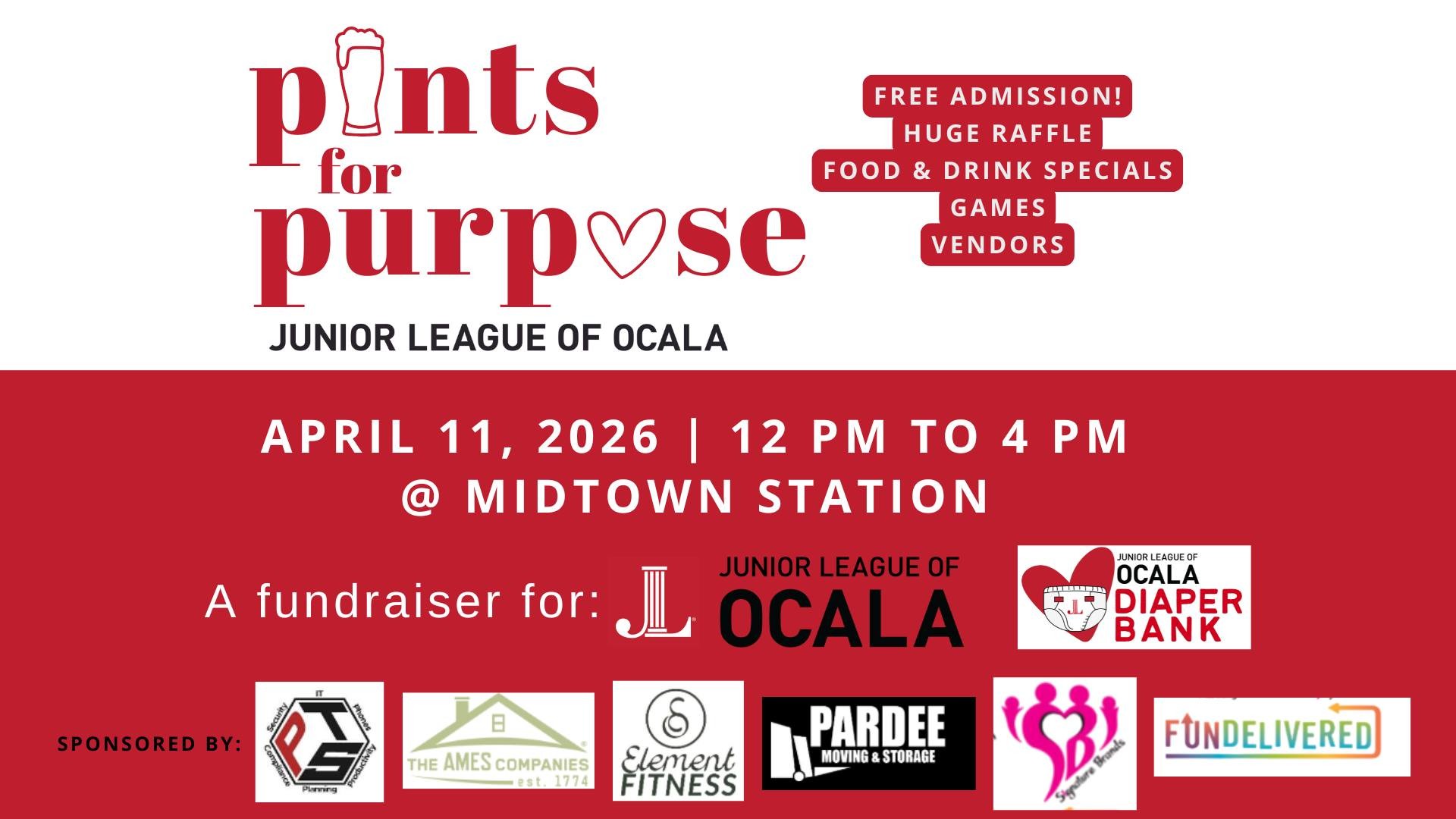 oin us for a fun-filled afternoon at Pints for Purpose at Midtown Station on Saturday, April 11th, from 12 PM to 4 PM! This exciting event is a fundraiser benefiting the Junior League of Ocala's vital diaper bank and other impactful community initiatives.