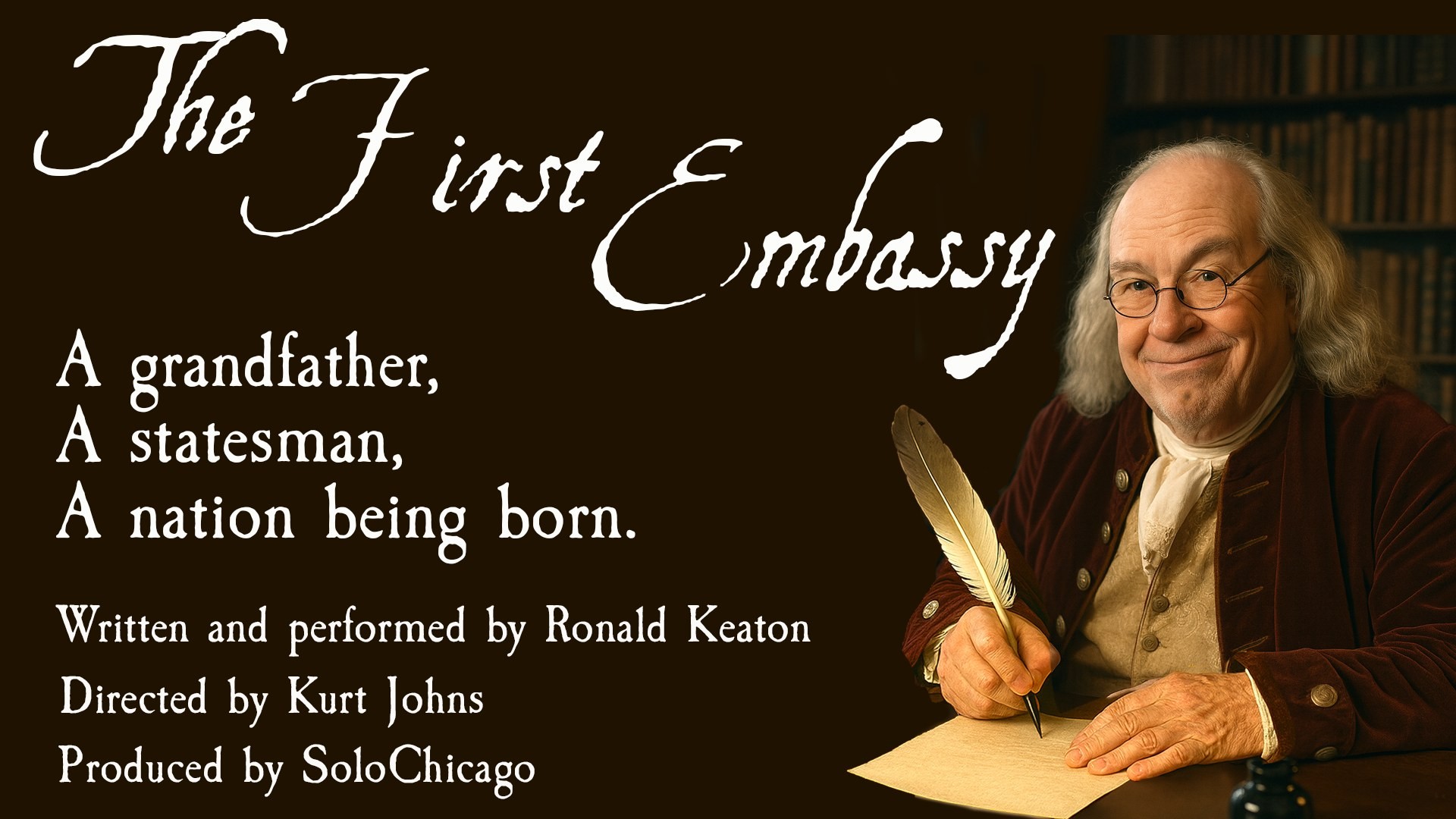 Now arrives his newest work, The First Embassy, as America celebrates the 250th anniversary of its independence. It explores the diplomatic mission of Benjamin Franklin, as he helps to secure the nation’s survival. It also shows us a softer side of the great man through his 16-year-old grandson, Temple. Through humor, humanity, and meticulous research, Keaton portrays the great man in France at the turning point of the Revolution – revealing the man behind the legend and the unique negotiations that changed history.
