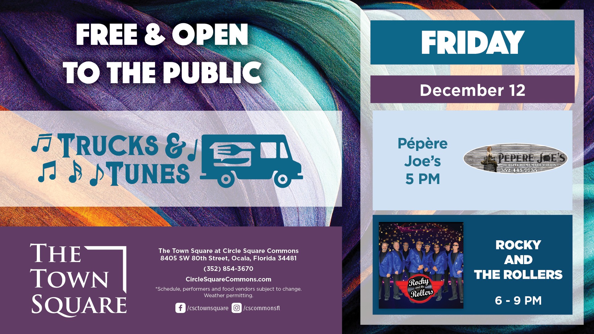 Free and open to the public (weather permitting). Coolers and well-behaved leashed pets are permitted outside at The Town Square.