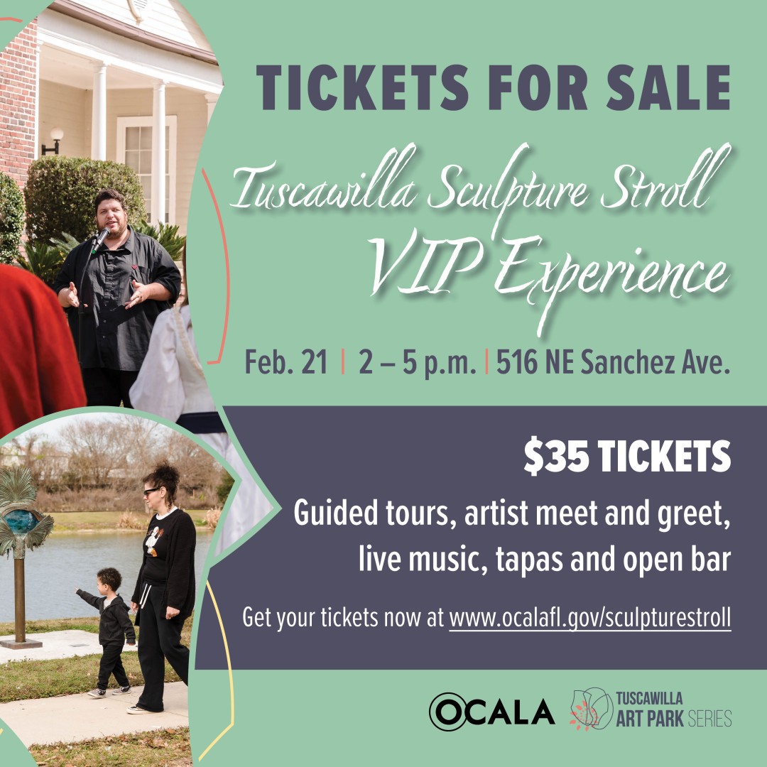 The City of Ocala presents the Tuscawilla Sculpture Stroll VIP Experience, offering exclusive access and special perks to make your stroll truly memorable. The VIP experience includes exclusive access to the VIP area from 2–5 PM at the Heart of the Park, 516 NE Sanchez Ave., Ocala, as well as private guided tours of the ten newly installed sculptures from the 2026–2027 Ocala Outdoor Sculpture Competition. Guests will also enjoy tapas and cocktails with an open bar, accompanied by live music from the Ocala Symphony Orchestra, along with an exclusive meet-and-greet with selected sculptors and unique event gifts for VIP attendees. Join us for this one-of-a-kind experience celebrating art, music, and community in Ocala’s beautiful Tuscawilla Park and Tuscawilla Art Park.